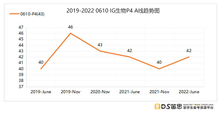 P4分数线情况 总分:80分 从上图可知,近6次P4考试A线的平均分为42.2分 今年A线:42分(稍低于平均分0.2分,比上一考季高出2分) 考试难度:从数据图上可见,IG生物近6次考试难度还是稍有起伏的,今年6月的考试难度相较于上一个考季而言是降低了一些。 稳A Tips 接下来要参加考试的同学要想P4稳在A,在日常的刷题练习中至少要做对52.8%的题。
