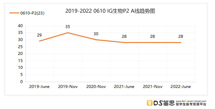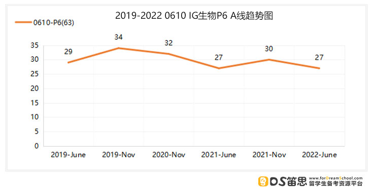 P6分数线情况 总分:40分 从上图可知,近6次P6考试A线的平均分为29.8分 今年A线:27分(低于平均分2.8分,比上一考季低了3分) 考试难度:从数据上来看,今年6月P6的考试难度相较于上一考季是有所增加的。 稳A Tips 接下来要参加考试的同学要想P6成绩稳定在A,需要注意的是平时刷题要做对74.5%以上的题,以此来应对考试难度上下波动较大的问题。 以上是关于IGCSE生物学科的部分A线的介绍分析,所有的小建议均是基于纯粹的数据。下面就基于IG生物学科的整体来看看要稳住A*,总体的IG生物需要达到什么样的水准?