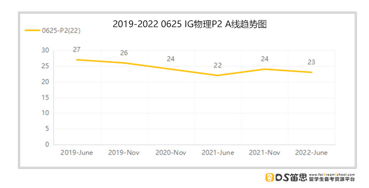 P2分数线情况 总分:40分 从上图中可以得知,近6次P2考试A线的平均分为24.3分 今年A线:23分(低于平均分1.3分,比上一考季低了1分) 考试难度变化:从数据反映的情况来看,今年6月P2的考试难度相较于之前的几次是稍加大了些。 稳A Tips 接下来参加考试的同学们,要想IG物理P2稳A,在平时的练习中至少要做对60.8%的分值题。
